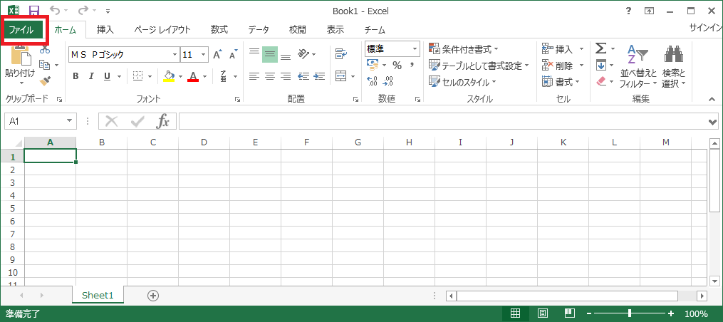 新規Bookを開いた後、「ファイル」メニューをクリックします。
