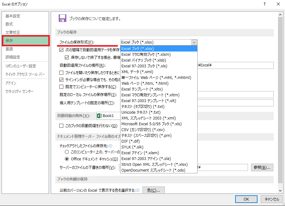 「保存」ページを選択し、「ファイルの保存形式」の項目で既定のファイル形式にしたいものを選択します。