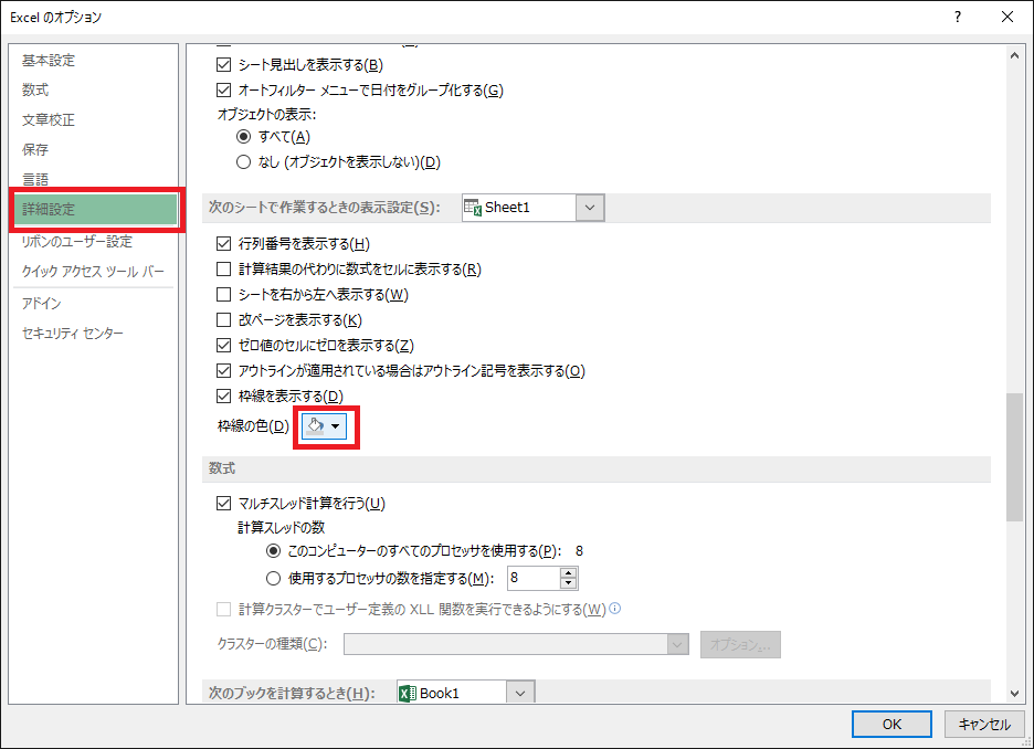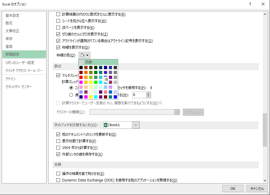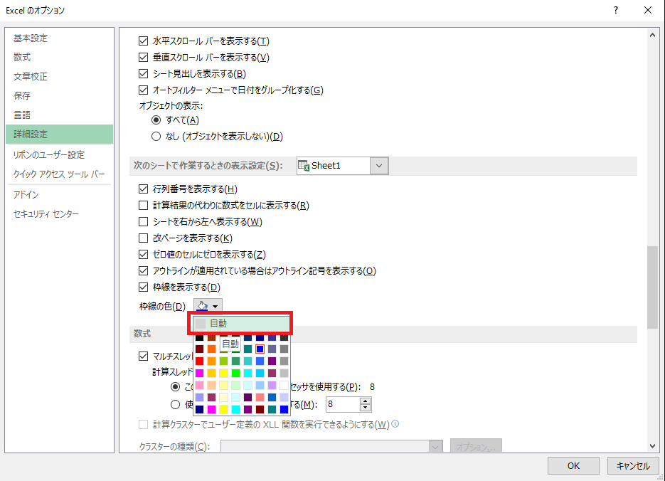 このセルの枠線の色ですが、設定で変更することができます。