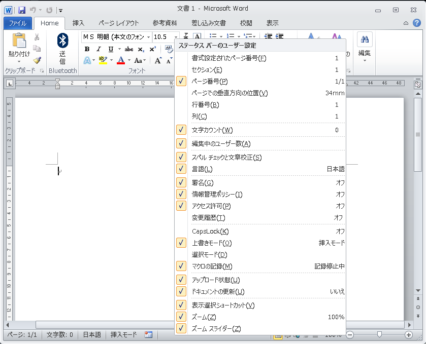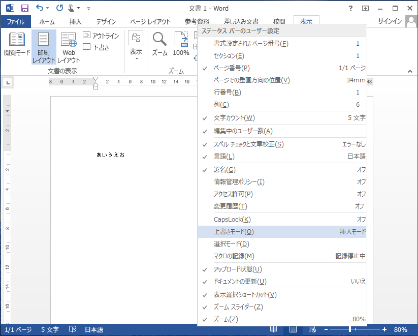 Word 2013 で「挿入モード」か「上書きモード」かを表示する方法