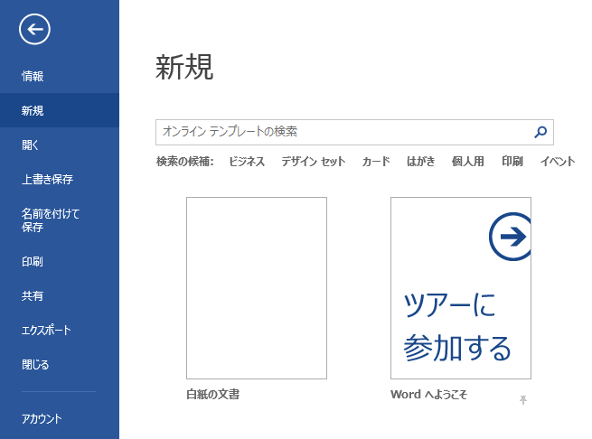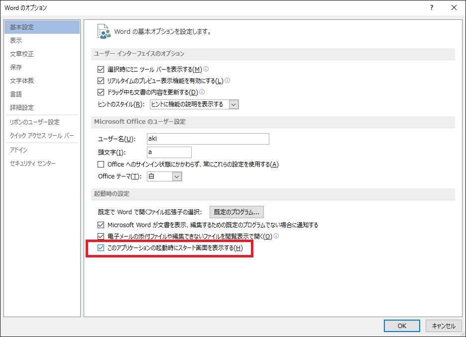 Word 起動時は白紙文書が選択された状態で起動し、必要なときはテンプレートを選択する。という従来の動きにしたい場合の設定です。