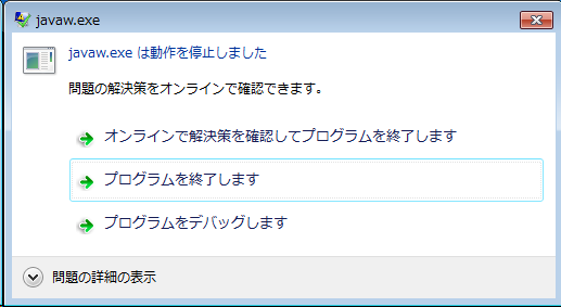 最初のコマンドプロンプトの画面が出た後 javaw.exe がエラーを出して終了してしまう。