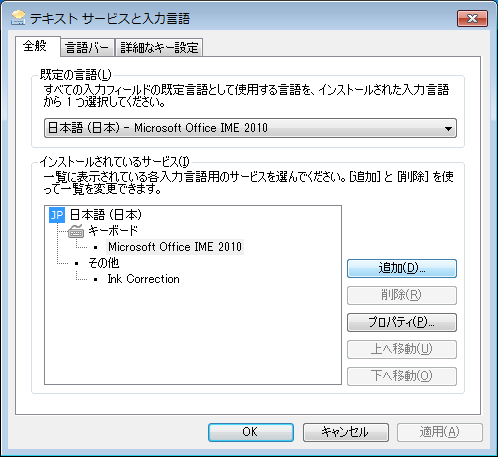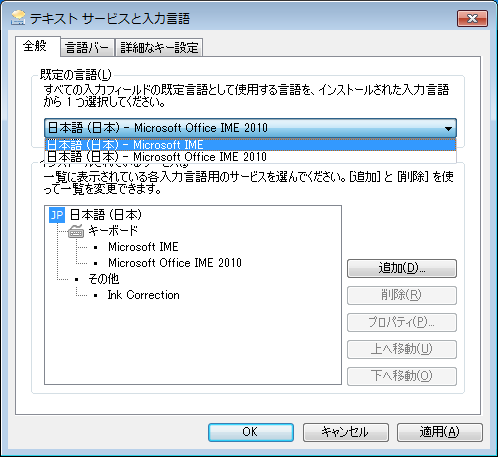 クリックで拡大 - 「既定の言語」のコンボボックスから IME 2007 もしくは IME 2010 以外のものを選択して「OK」をクリックします。