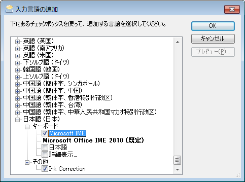 クリックで拡大 - ずっと下の方へスクロールして「日本語(日本)」を展開し、「キーボード」の中の「Microsoft IME」にチェックを入れて「OK」をクリックします。
