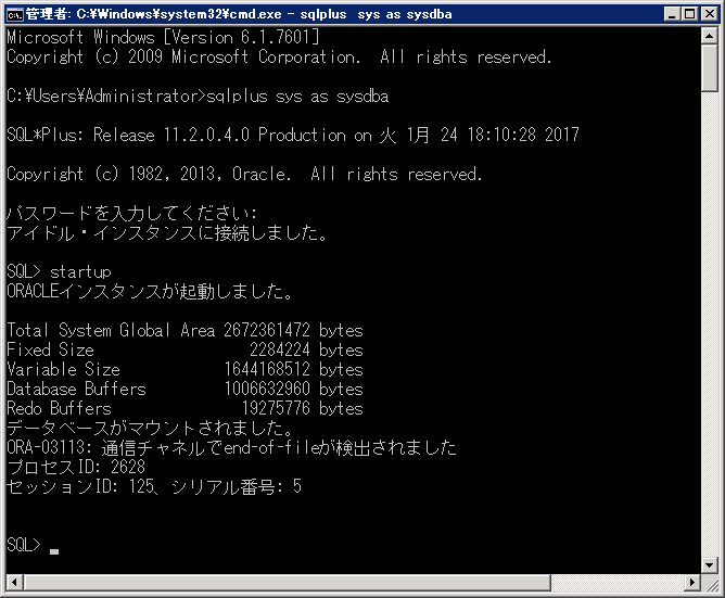 Oracle データベース起動時に ORA-03113 エラーが発生しました。