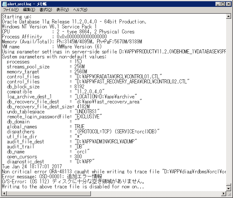 - アラートログを確認すると起動時のログとその際のエラー内容が記録されていました。