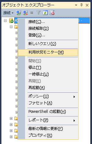 - SQL Server Management Studioを起動し、データベース名の部分で右クリックして「利用状況モニター」をクリックします。