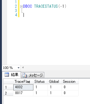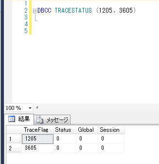 DBCC TRACESTATUS (1205, 3605) GO TraceFlag Status Global Session ------------------------------------ 1205 0 0 0 3605 0 0 0 ※引数は複数指定できます。 Status トレースフラグが有効か否か 0:無効 1:有効 Global グローバルに設定されたものか 0:False 1:True Session セッションに対してされたものか 0:False 1:True