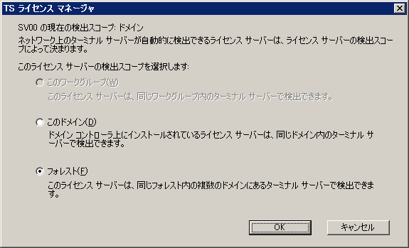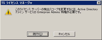 このライセンス サーバーはドメインコントローラ上にインストールされていません。ドメイン内のターミナル サーバーで、このライセンスサーバーを自動検出することはできません。