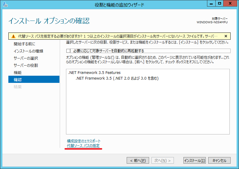 - インストールウィザード途中の【インストールオプションの確認】の画面で「代替ソースパスの指定」をクリックします。