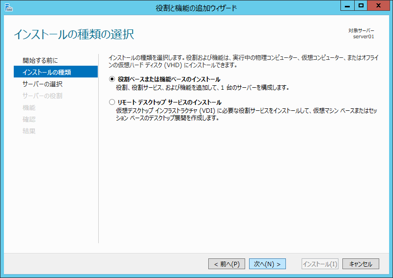 「役割ベースまたは機能ベースのインストール」を選択して「次へ」をクリックします。
