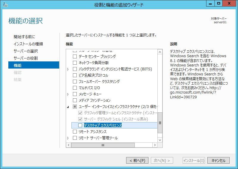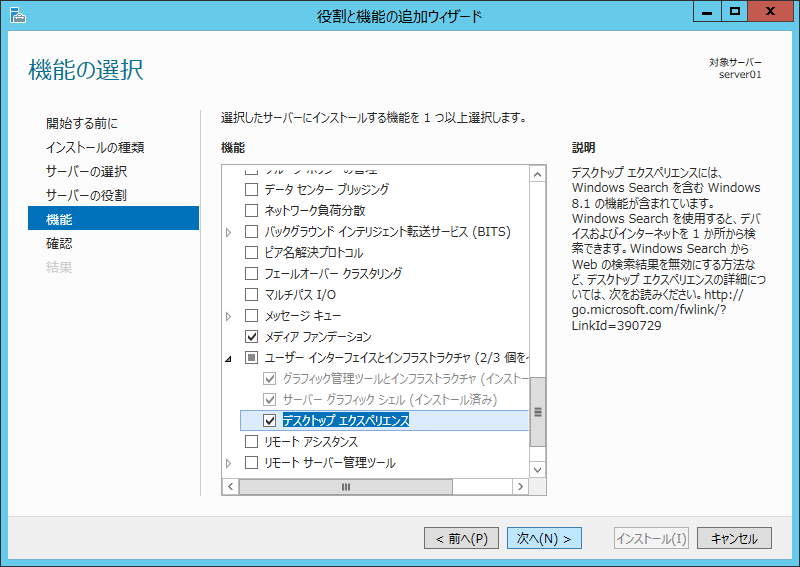 「デスクトップ エクスペリエンス」にチェックが入ったことを確認して「次へ」をクリックします。