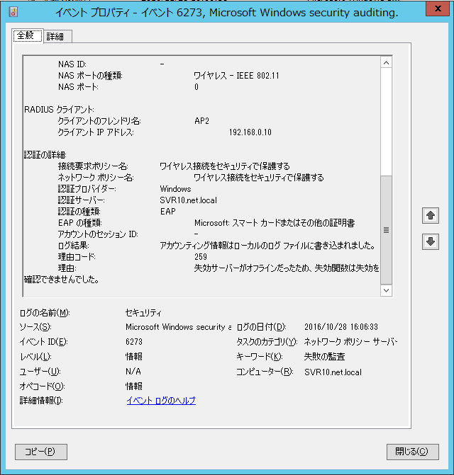 RADIUSサーバーのイベントログを確認すると以下のようなエラー(失敗の監査)が記録されていました。