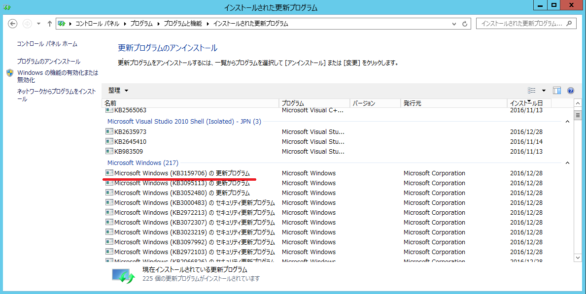 調べてみたところ、「KB3159706」がインストールされるとこうなるようです。
