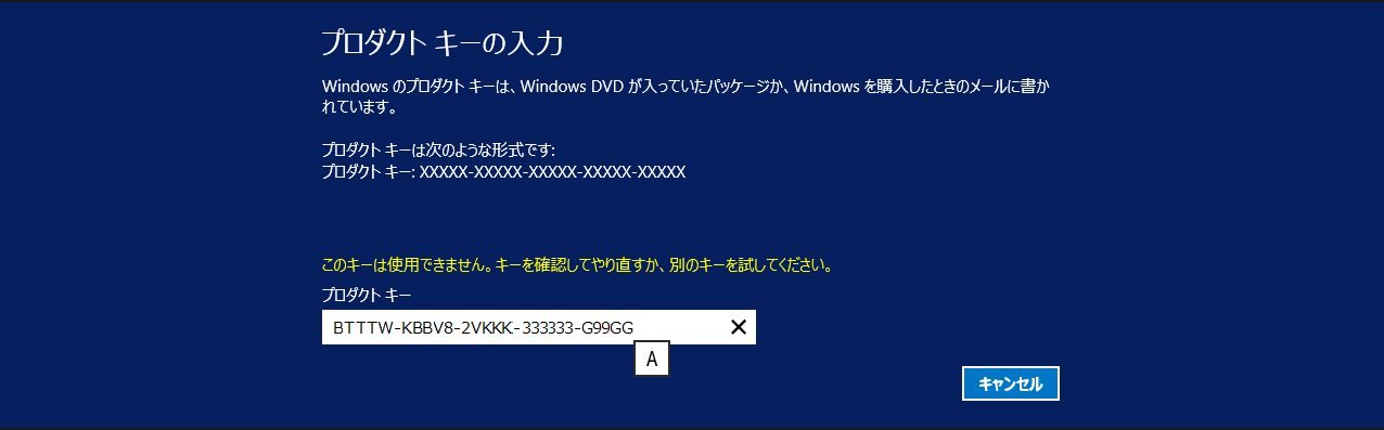 このキーは使用できません。キーを確認してやり直すか、別のキーを試してください。