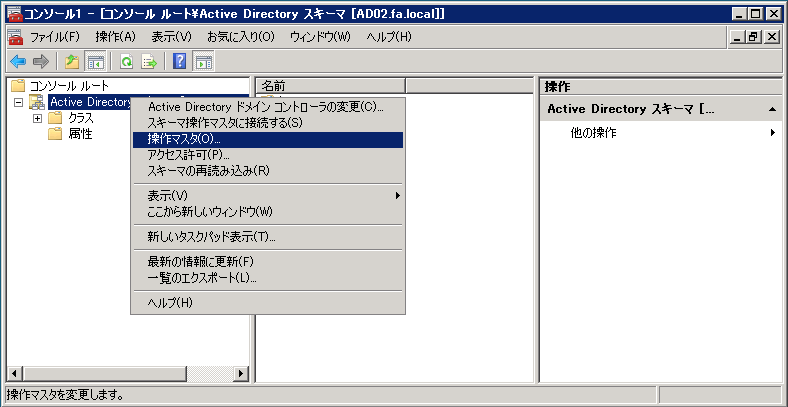 クリックで拡大 - 再度、ツリーから「Active Directory スキーマ」スナップインを右クリックして、次は「操作マスタ」をクリックします。