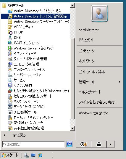 - スタートメニューから[管理ツール] - [Active Directory ドメインと信頼関係]を起動します。