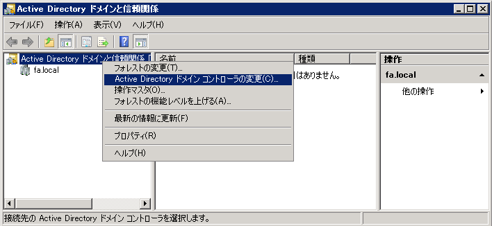左ペインのツリーから「Active Directory ドメインと信頼関係」を右クリックして「Active Directory ドメイン コントローラの変更」をクリックします。