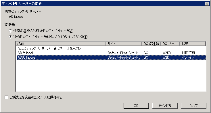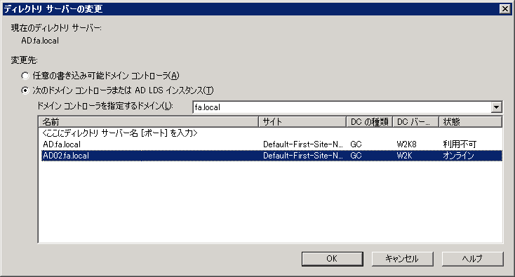 クリックで拡大 - 接続先のドメインコントローラを変更します。