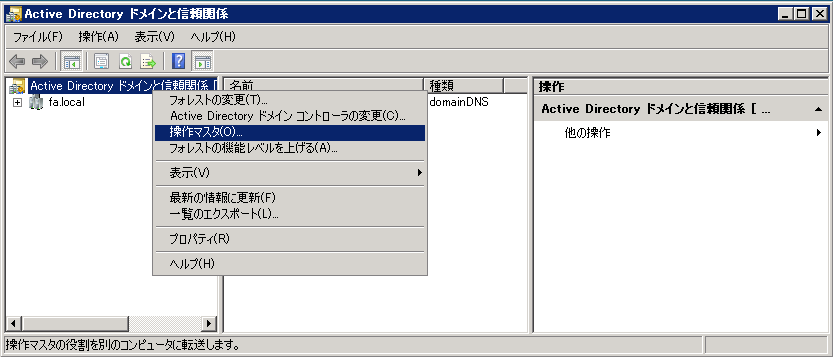 クリックで拡大 - 再度、ツリーから「Active Directory ドメインと信頼関係」を右クリックして、次は「操作マスタ」をクリックします。