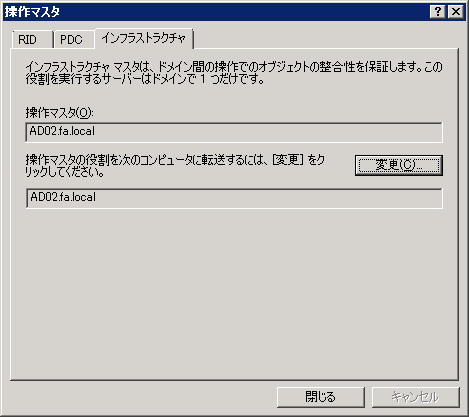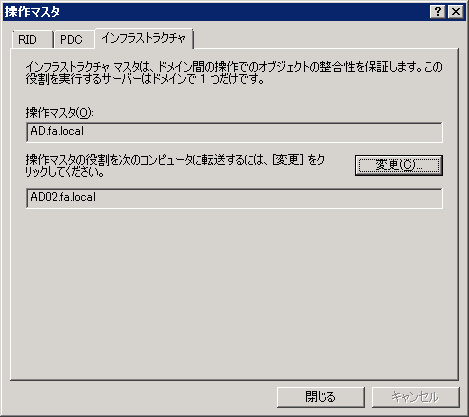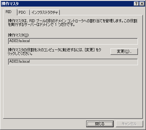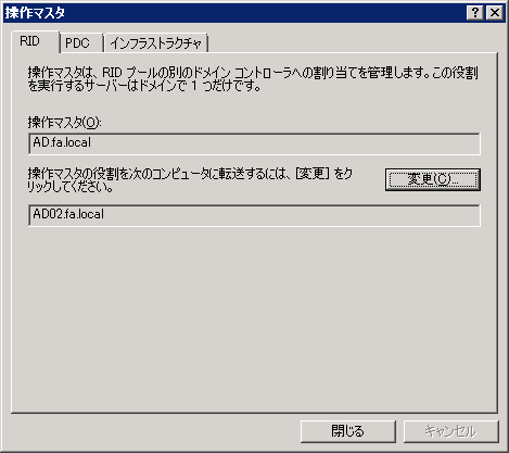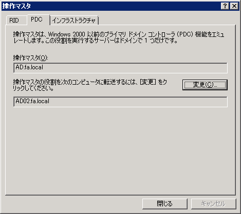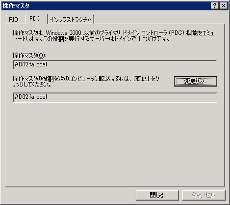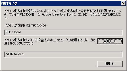 上の段が現在のドメイン名前付け操作マスタ、下の段(変更先)が現在接続しているドメインコントローラが表示されています。
