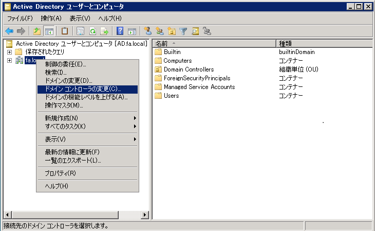 左ペインのツリーからドメインのルートを右クリックして「ドメイン コントローラの変更」をクリックします。