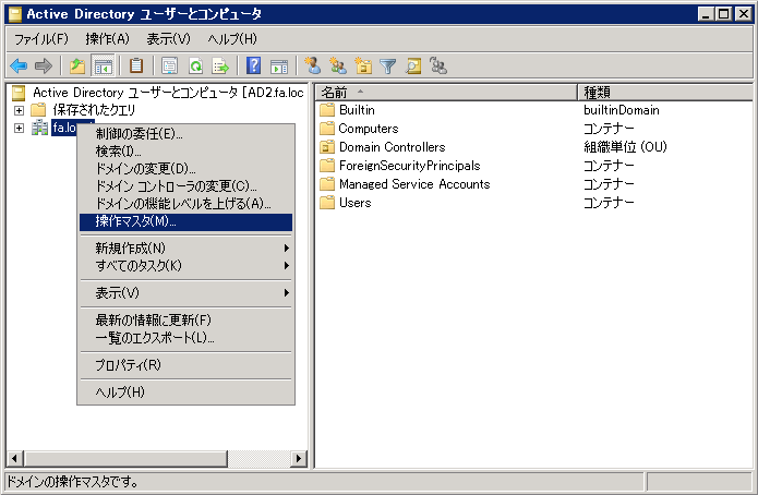 クリックで拡大 - 再度、ツリーからドメインのルートを右クリックして、次は「操作マスタ」をクリックします。
