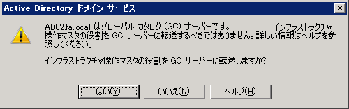 ※移行先の(まだ操作マスタではない)ドメインコントローラへ接続しましたのでメッセージの内容は合っています。