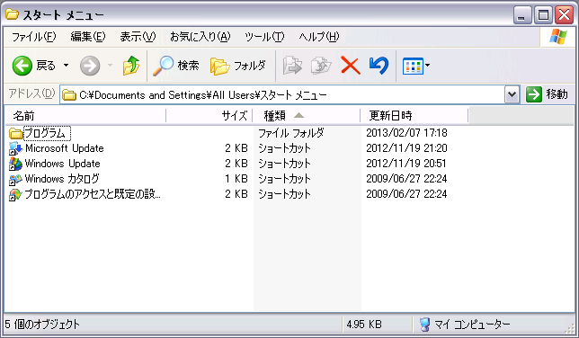Windows XP の「C:\Documents and Settings\All Users\スタート メニュー」フォルダ。