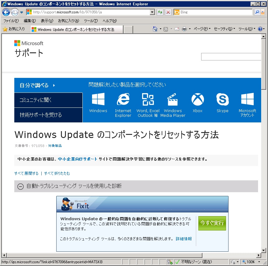 Windows Update のコンポーネントをリセットする方法へアクセスし、「今すぐ実行」をクリックします。