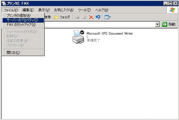 Windows XP や Windows Server 2003 では「プリンタとFAX」の「ファイル(F)」メニューに「サーバーのプロパティ」という項目があったが、