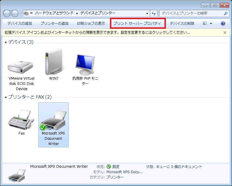 Windows 7 ・Windows Server 2008 の場合、なんでもいいのでプリンターをひとつ選択すると画面上部に「プリントサーバープロパティ」のボタンが現れる。