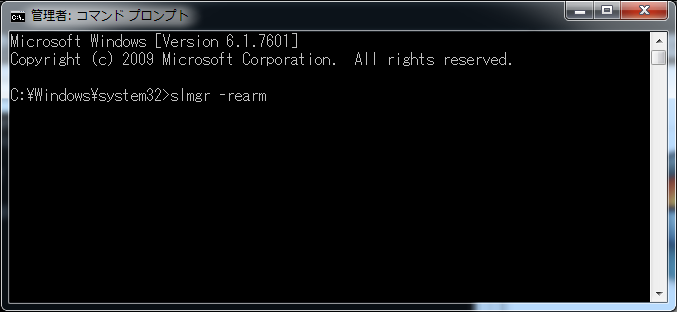 「slmgr -rearm」と入力して実行します。