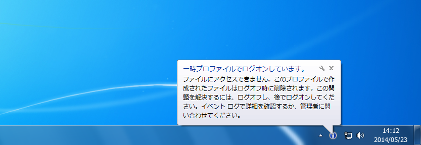 そのユーザーでログオンしたところ、「一時プロファイルでログオンしています」と表示され、一時プロファイルを使用してログオンされており、ユーザープロファイルが新しくなりません。