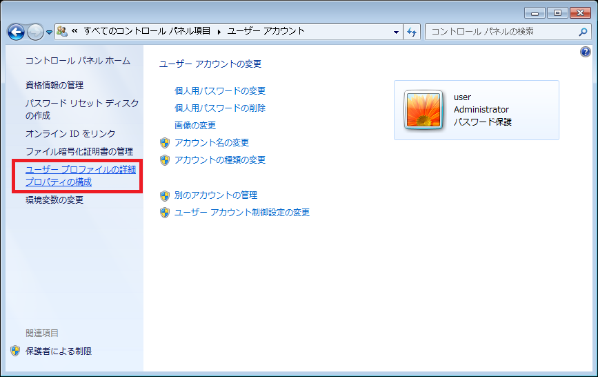 クリックで拡大 - ユーザーアカウントの画面から「ユーザープロファイルの詳細 プロパティの構成」を起動します。