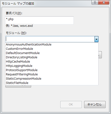 PHP のモジュールマップを追加する際、モジュールの一覧に「FastCgiModule」が一覧にない