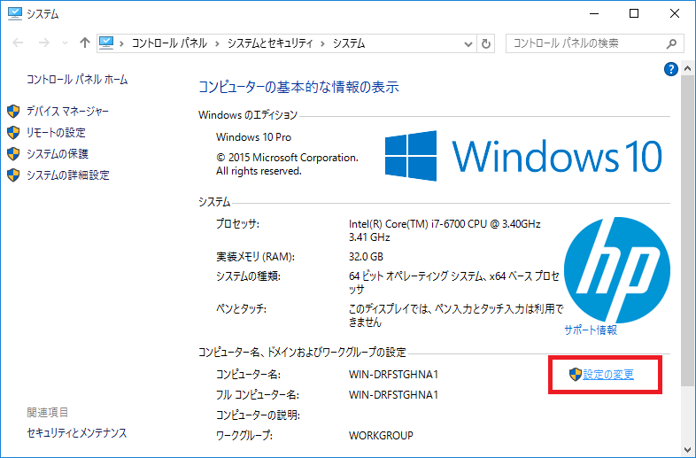 - コンピューター名の横にある「設定の変更」と書かれたリンクをクリックします。