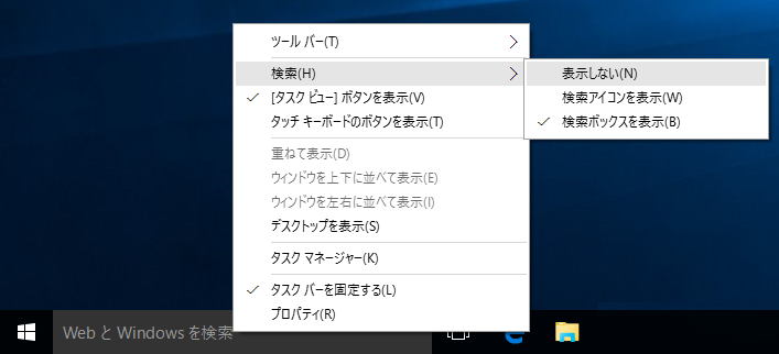 再度表示する場合は「検索」から「検索ボックスを表示」を選択すると表示できます。