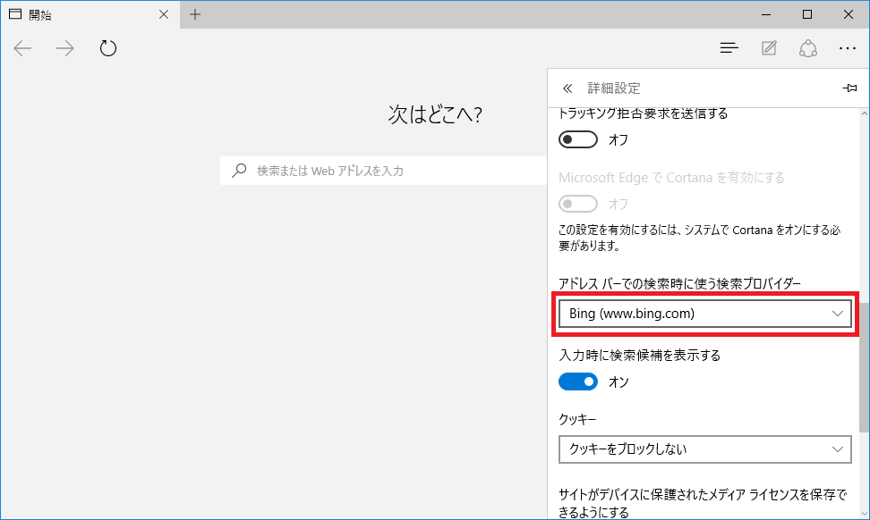 詳細設定メニューの後半にある「アドレスバーでの検索時に使う検索プロバイダー」という項目をクリックします。
