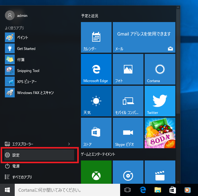 - スタートメニューを表示し、「設定」をクリックします。