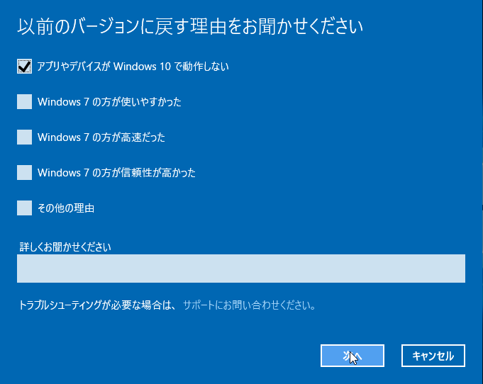 - Windows 7 に戻す理由を回答し、「次へ」をクリックします。