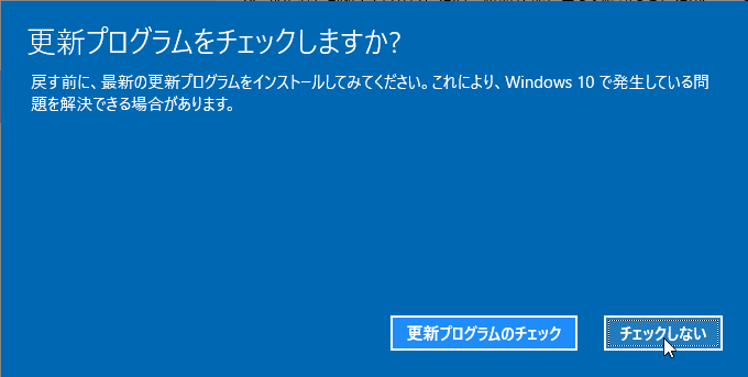 - 戻す理由で「アプリやデバイスがWindows 10 で動作しない」を選んだからか、Windows Update を勧められますが、「チェックしない」をクリックして次へ進みます。