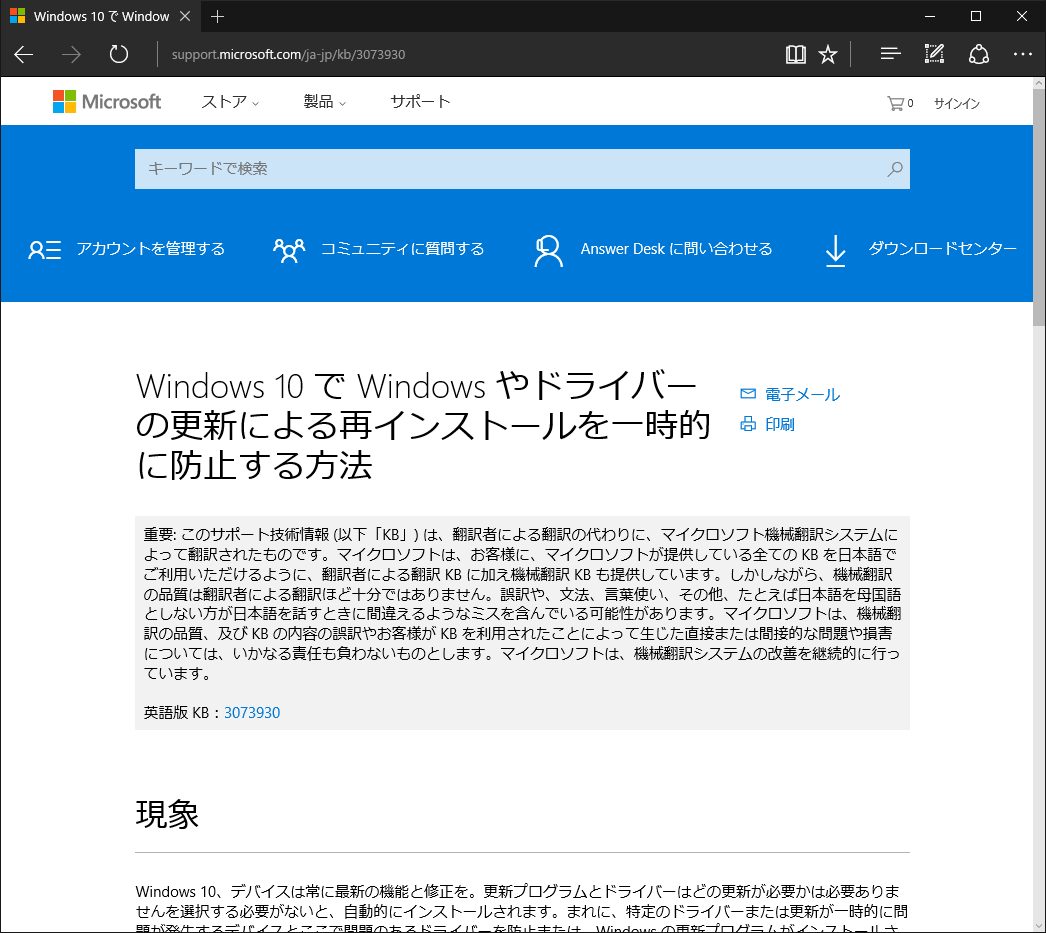 [Microsoft TechNet] Windows 10: 問題を起こした更新プログラムやドライバーを Windows Update で一時的にインストールされないようにするツールの紹介