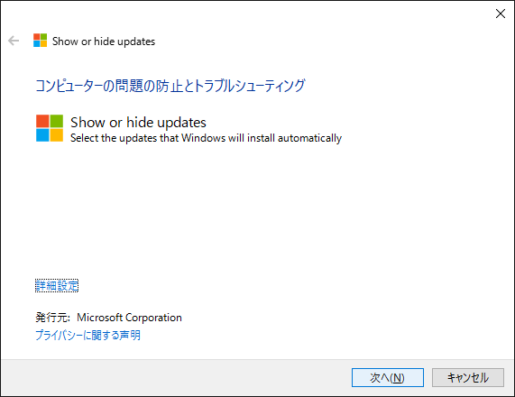 - ダウンロードしたツール「wushowhide.diagcab」をダブルクリックして起動します。