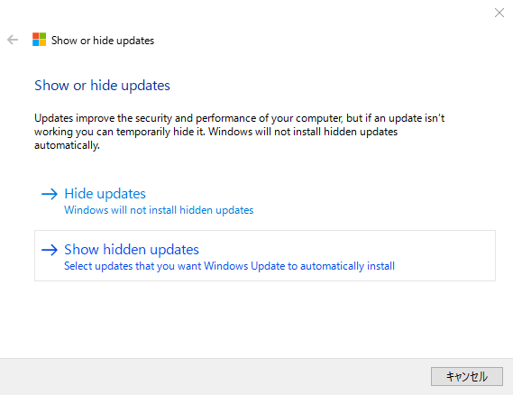 - 上記6.の手順で、「Show hidden updates」をクリックします。