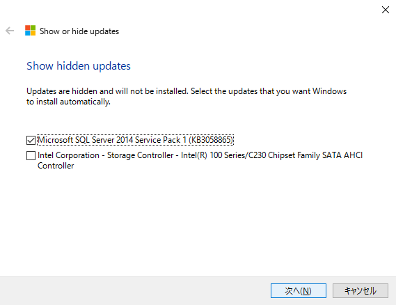 - 今ブロックしている更新プログラムの一覧が表示されますので、ブロックを解除する更新プログラムにチェックを入れて「次へ」をクリックします。