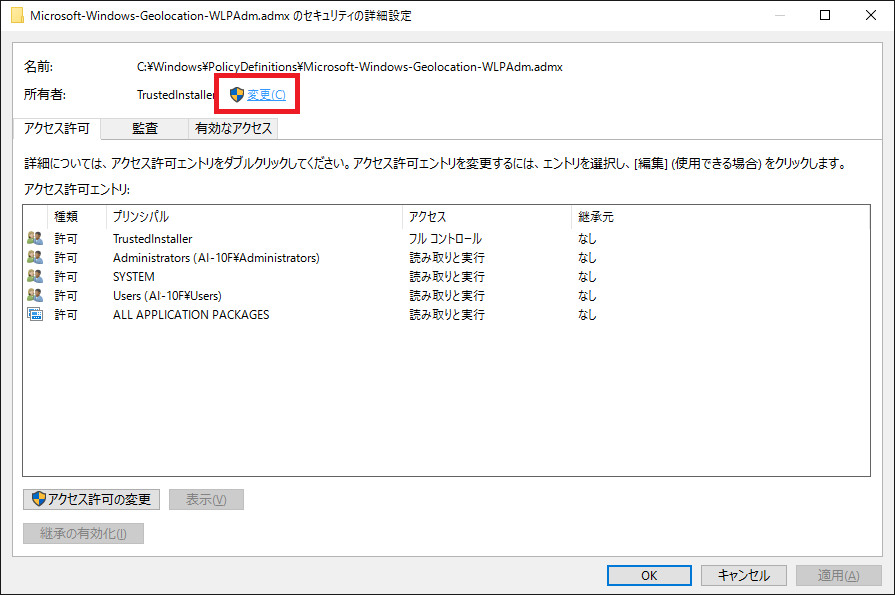 - 詳細設定画面が開いたら、所有者の項目にある「変更」リンクボタンをクリックします。