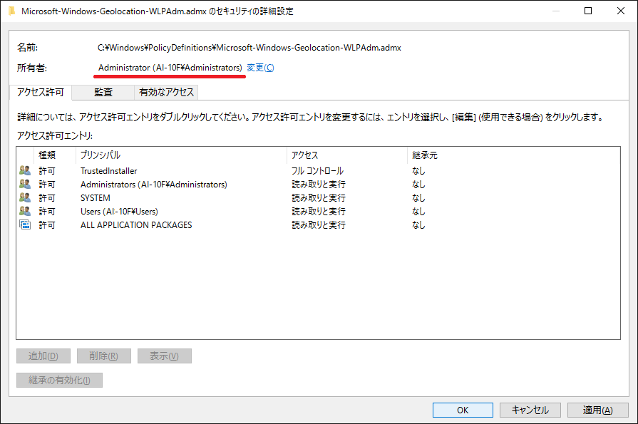 Administrator にも権限がないので、まず権限を変更しないといけません。