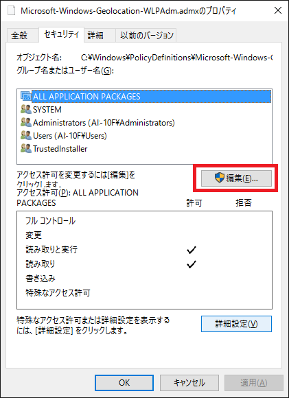 - ファイルのプロパティ画面に戻ったらアクセス許可を変更する「編集」ボタンをクリックします。