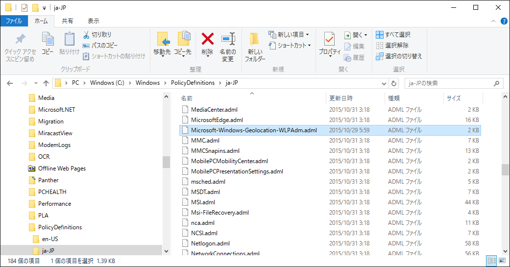 フォルダー内にある「Microsoft-Windows-Geolocation-WLPAdm.adml」を探します。